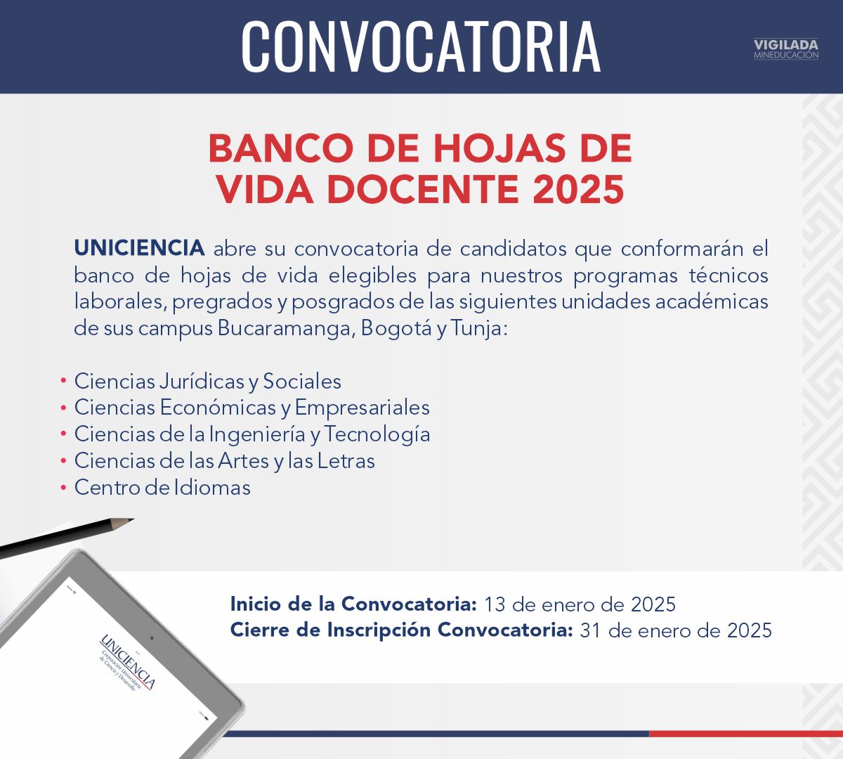 Todos los detalles se podrán consultar en la Convocatoria pública No. 01-2025 para la selección de candidatos que conformarán el banco de hojas de vida de docentes elegibles para los diferentes programas de formación de la CORPORACIÓN UNIVERSITARIA DE CIENCIA Y DESARROLLO -UNICIENCIA” que se encuentra como documento adjunto.